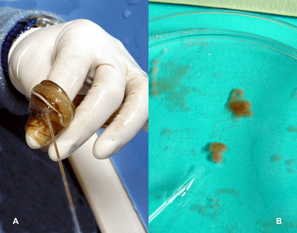 . Egg collection. The eggs, gently sucked up with a pipette (A), are transferred into a dish with filtered seawater (B).