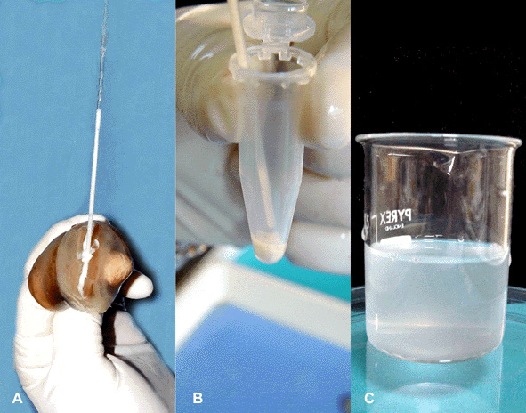 | Figure 6. Sperm collection. (A) Sperm are collected by a pipette and (B) stored dry until their use for insemination. In order to prepare an optimal sperm suspension for egg fertilization, one drop of dry sperm is diluted with 50 ml of filtered seawater, so that a slightly milky solution is obtained (C).