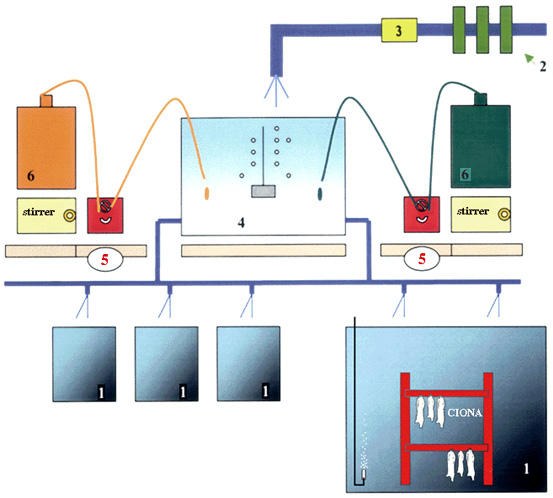 | Figure 10. Scheme of the setup for culturing C. intestinalis. Details of its functioning are given in Appendix 2. A general view of the feeding system is shown in Fig. 14. Key: (1) experimental aquaria; (2) cartridge filters; (3) U.V. sterilizer; (4) "food tank"; (5) peristaltic pumps; (6) food bottles .