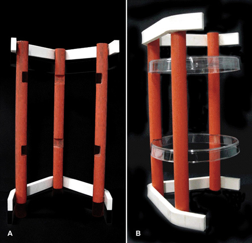 | Figure 12. Holding supports for dishes. (A) Special supports designed to hold pairs of dishes horizontally (front view); (B) Lateral view of a support containing dishes. See Fig. 13 for the holding apparatus in use.