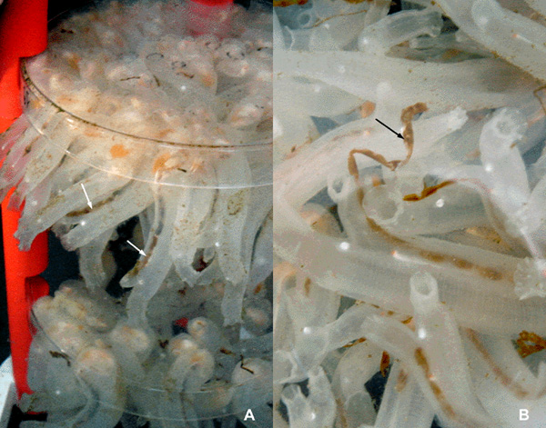 | Figure 16. Filtering juveniles of cultivated C. intestinalis. An estimate of filtration efficiency of growing animals (attesting to their healthy state) is given by: (A) gut fullness (arrows indicate the intestine); and (B) release of fecal strings (indicated by arrows) from the atrial siphon.